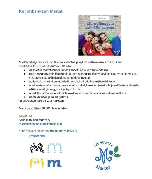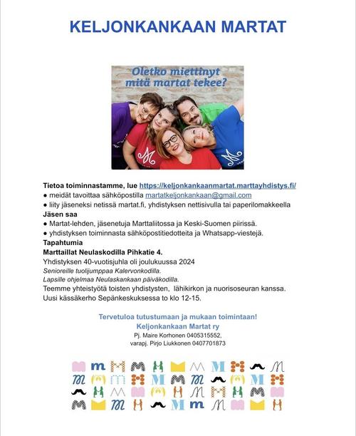 Marttailtamme ovat kaikille avoimia, voit tulla tutustumaan meihin. Jäsenenä saat monipuolisen lehden neljä kertaa vuodessa ja muita etuja. Teemme yhteistyötä naapuriyhdistysten, Keljonkankaan yhtenäiskoulun, lähikirkon, lähikirjaston, päiväkodin, Sammonkodin Säätiön ja Jyväskylän seudun nuorisoseuran kanssa.