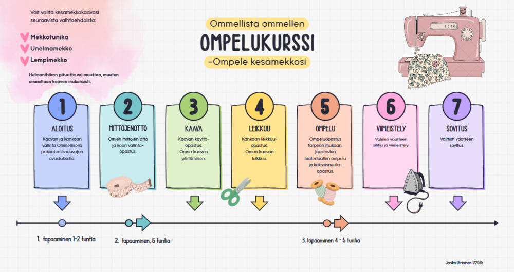 Ensimmäinen tapaaminen pidetään Ommellisella (esim ti tai ke 12 tai 13.5), jossa saat henkilökohtaista apua juuri sinulle parhaan mekkomallin, kuosin ja värin valintaan. Osallistujat hankkivat kankaan ja siihen sopivan ompelulangan itse, mutta kaava sisältyy kurssihintaan. Toisella tapaamiskerralla (La 16.5 ) käydään läpi mittojen ottoa, koon valintaa, kaavan käyttöä ja leikataan kangas valmiiksi ompelua varten sekä pääsemme aloittelemaan ompelua. Kolmannella tapaamiskerralla (Su 17.5) keskitytään ompeluun ja ommellaan ihana kesämekko valmiiksi.