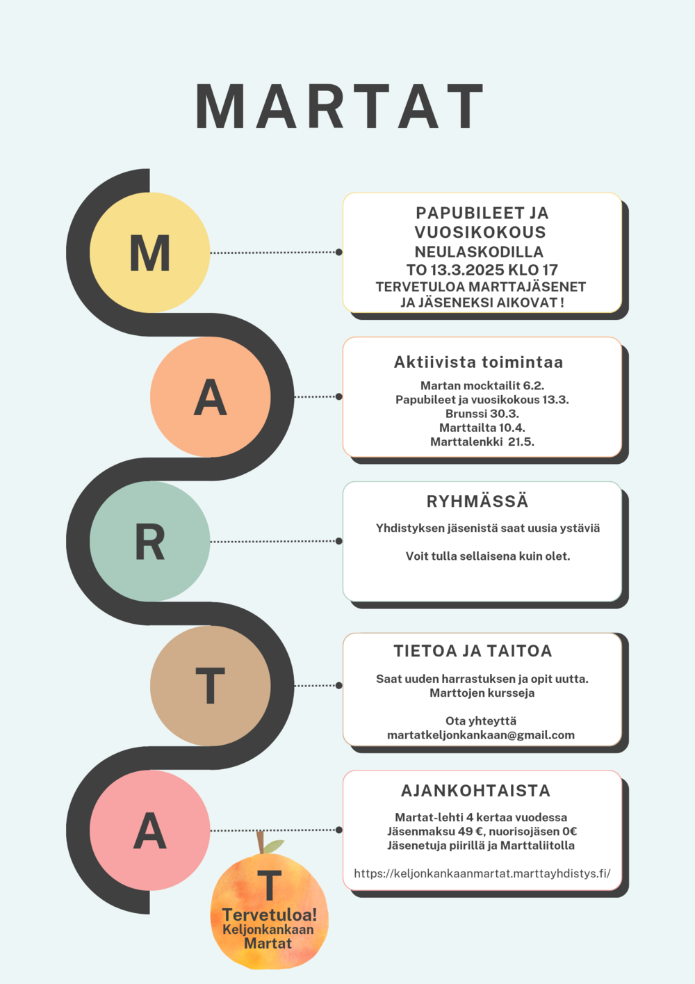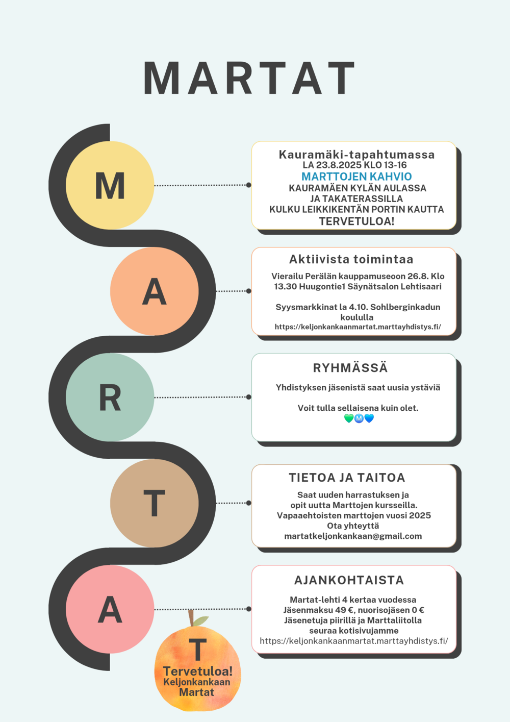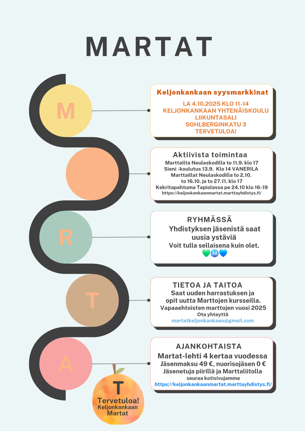 Keljonkankaan yhtenäiskoulun kouluyhdistyksen kanssa syysmarkkinat la 5.10.24 Sohlberginkadun koululla klo 11-14. Martoilla oma myyntipöytä.